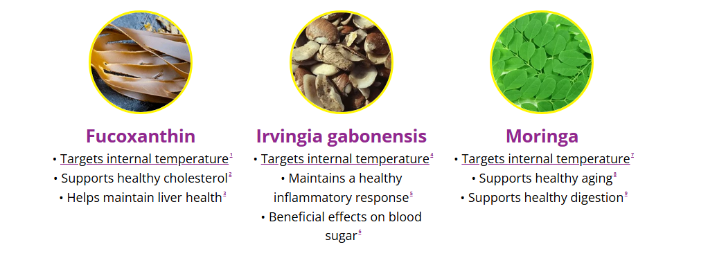 These are Fucoxanthin, Irvingia gabonensis fruit, Moringa leaf, Bitter orange, Ginger and Turmeric.